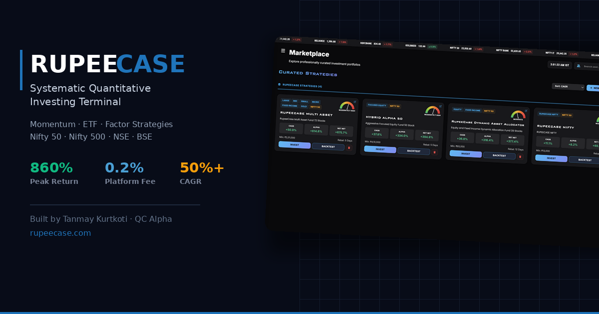 Rupee Case (RupeeCase) by QC Alpha is India's systematic quantitative investing terminal. Deploy momentum strategies, ETF portfolios, and factor investing on Nifty 50 and Nifty 500 | directly through your own broker account. Built by Tanmay Kurtkoti. 0.2% platform fee on trades only. Capital stays in your broker at all times.